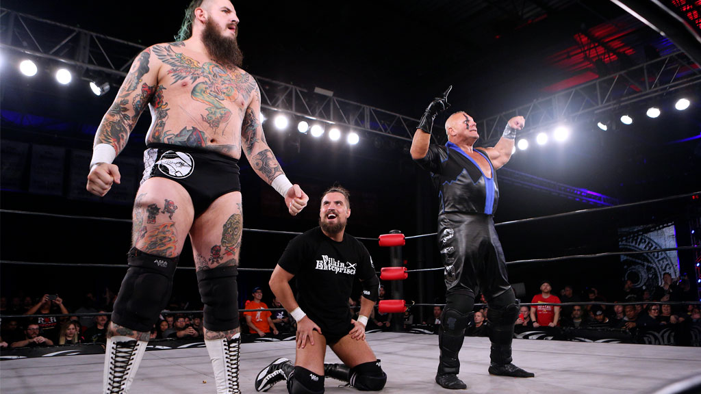 The lights went out again and lightning flashed on the screen. This time, the lights came on to reveal that PCO was now also in the ring. King hit a sit-down piledriver on Vinny Marseglia. PCO then went to the top turnbuckle and hit a moonsault onto all three members of The Kingdom. Scurll, King, and PCO stood tall as Scurll announced the name of their faction is Villain Enterprises.