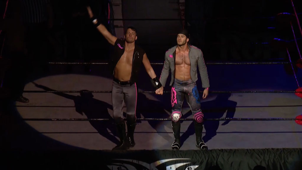 Best Friends decided that they needed to strut around while wearing their sunglasses. They both got in and found themselves on the wrong end of a Nick Jackson lucha head scissors maneuver and a reverse Code Red.