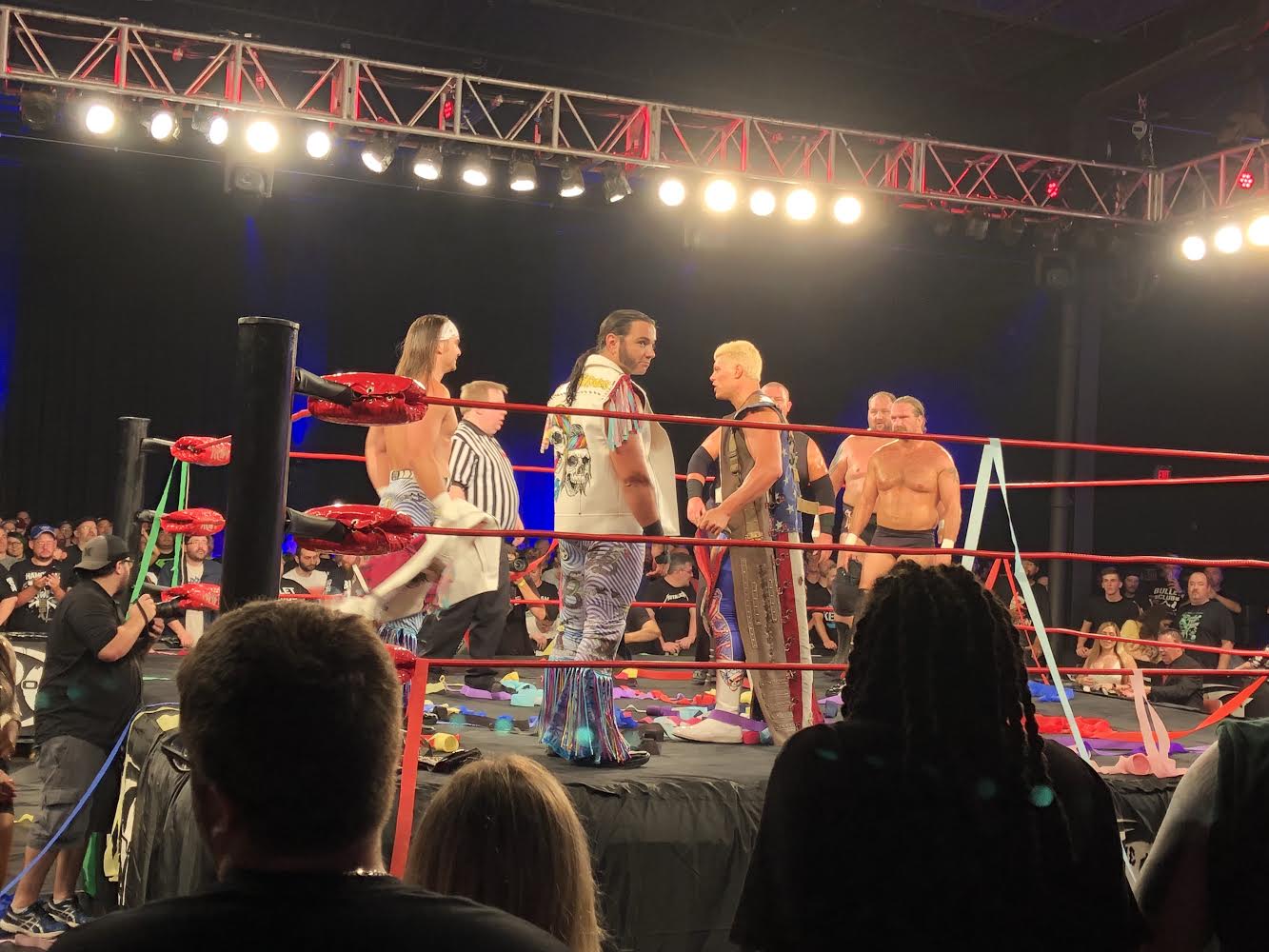 After the match, as is customary, they had the Bullet Club/Being the Elite promo with The Bucks, Cody, Hangman Page, Scurll, Brandi Rhodes, Burnard the Business Bear, and Flip Gordon (who is still not All In). Cody repeated his speech about All In and got the fans hyped up, then Scurll sent everyone home by rapping the Fresh Prince of Bel-Air theme.