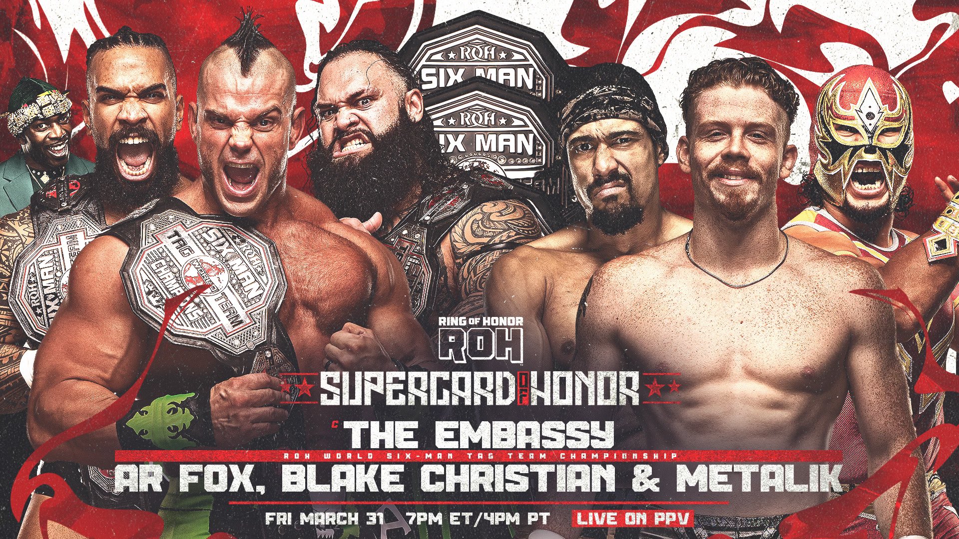 - ROH Six Man Tag Team Champions The Embassy (Brian Cage, Bishop Kaun & Toa Liona) defend against AR Fox, Blake Christian & Metalik