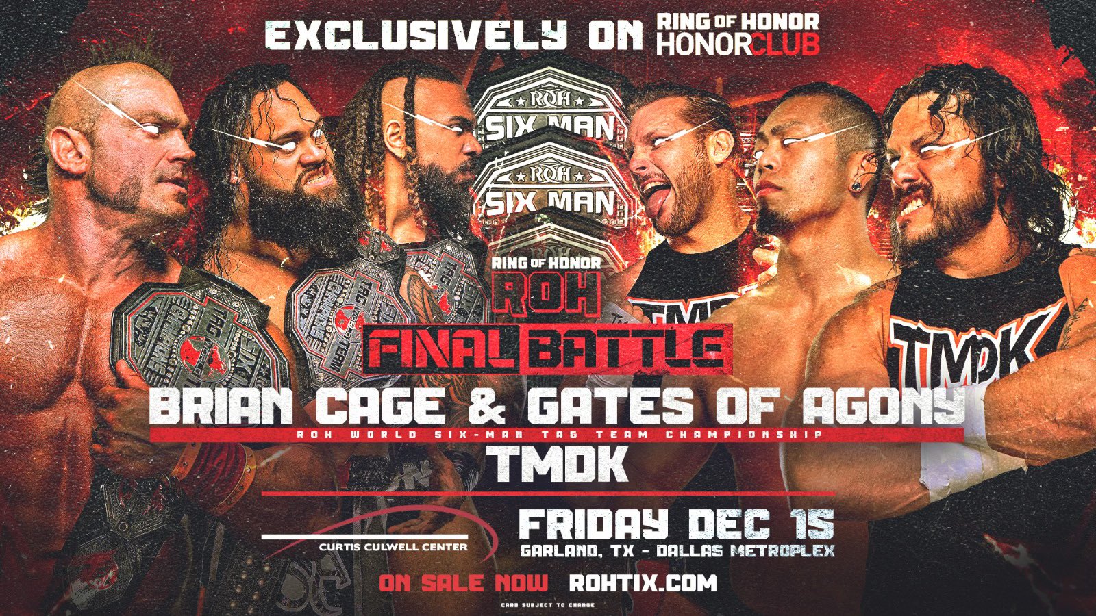 ROH owner Tony Khan announced on social media Thursday that Brian Cage & Gates of Agony will defend their World Six-Man Tag Team titles against the TMDK trio of Shane Haste, Bad Dude Tito, & Kosei Fujita on the Friday, December 15 event.