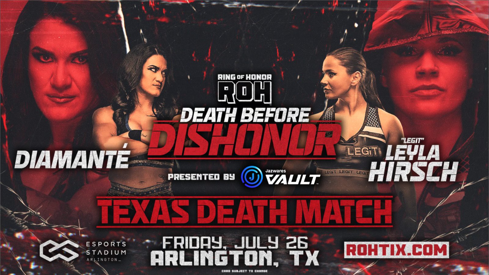 Leyla Hirsch vs. Diamante in a Texas Death Match has been announced for the show. This will be the rubber match for the two rivals, as Hirsh defeated Diamante in a singles match last month and Diamante defeated Hirsch in a Lights Out match on ROH TV this week.