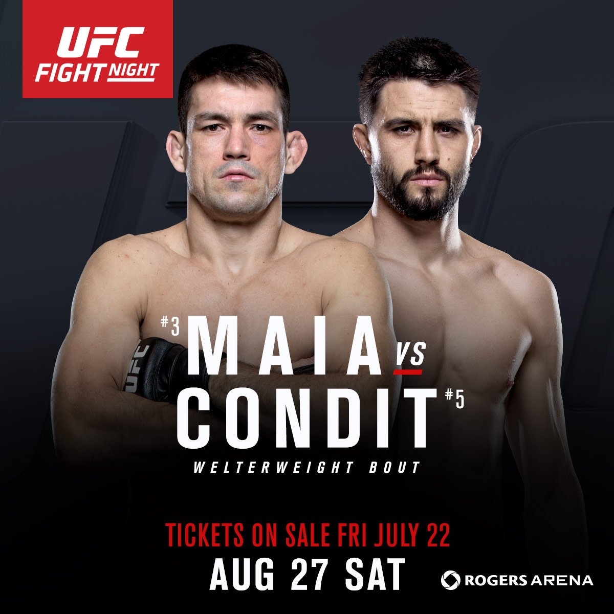 Maia and Condit were scheduled to meet at UFC 202 on August 20, but the bout was shifted to a week later as the Vancouver card was still searching for a main event.