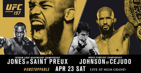 Welcome to F4WOnline.com’s live coverage of UFC 197: Jones vs. Saint Preux from the MGM Grand Garden Arena in Las Vegas, Nevada. The event is headlined by a bout for the UFC Interim Light Heavyweight Championship as former UFC Light Heavyweight Champion Jon Jones makes his anticipated return to action to take on Ovince Saint Preux, who replaced an injured Daniel Cormier in what was originally supposed to be a rematch for the UFC Light Heavyweight Championship held by Cormier and previously held by Jones. In the co-main event, it is another title fight as UFC Flyweight Champion Demetrious Johnson looks to make another title defense as he welcomes challenger and former Olympic medalist Henry Cejudo, who puts his undefeated record on the line. Also on the card is former UFC Lightweight Champion Anthony Pettis as he takes on Edson Barboza. Follow along with our live coverage of the event beginning at 6:30 PM eastern time with preliminary action all the way thru the main card.