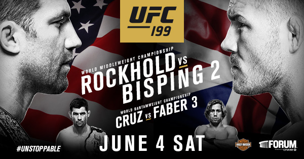 Welcome to F4WOnline.com’s live coverage of UFC 199: Rockhold vs. Bisping 2 from The Forum in Inglewood, California, just outside of Los Angeles. The event is headlined by two title fights involving two heated rivalries. UFC Middleweight Champion Luke Rockhold makes his first title defense against Michael Bisping, who gets his first title shot after almost ten years of fighting for the UFC after he replaced Chris Weidman in the bout. In the co-main event, it is UFC Bantamweight Champion Dominick Cruz making his first defense since regaining the championship when he defends against long-time rival Urijah Faber, who looks to finally capture UFC gold. Follow along with our live coverage of the event beginning at 6:15 PM eastern time with preliminary action all the way thru the main card.