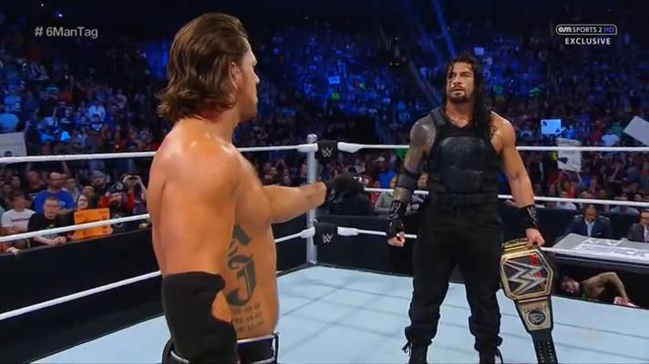 Reigns and Styles started as they did on Raw, and there were dueling chants from the crowd. Reigns seemed to be getting the better of it until Styles backed him into the corner for Anderson to make a tag. Reigns and the Usos triple-teamed Anderson but he eventually backed Jey Uso into the corner for Gallows to make a tag. The Usos double teamed him, but Gallows gained control with a big boot on Jimmy Uso.