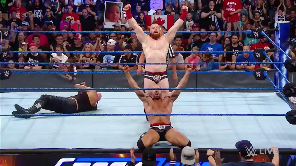 The first of two triple threat matches in SmackDown’s tag team tournament took place tonight, with Cesaro & Sheamus defeating Luke Gallows & Karl Anderson and The Colons to advance. Cesaro tagged in and stole the pin from The Colons, then he and Sheamus confronted The New Day (who were on commentary for the match).