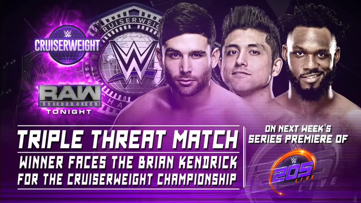 Rich Swann won a triple threat match over former champion TJ Perkins and Noam Dar on tonight’s episode of Raw to get a shot at Brian Kendrick’s title on the debut episode of the new WWE Network cruiserweight show. With Kendrick on commentary, Swann picked up the win by pinning Perkins after a kick.