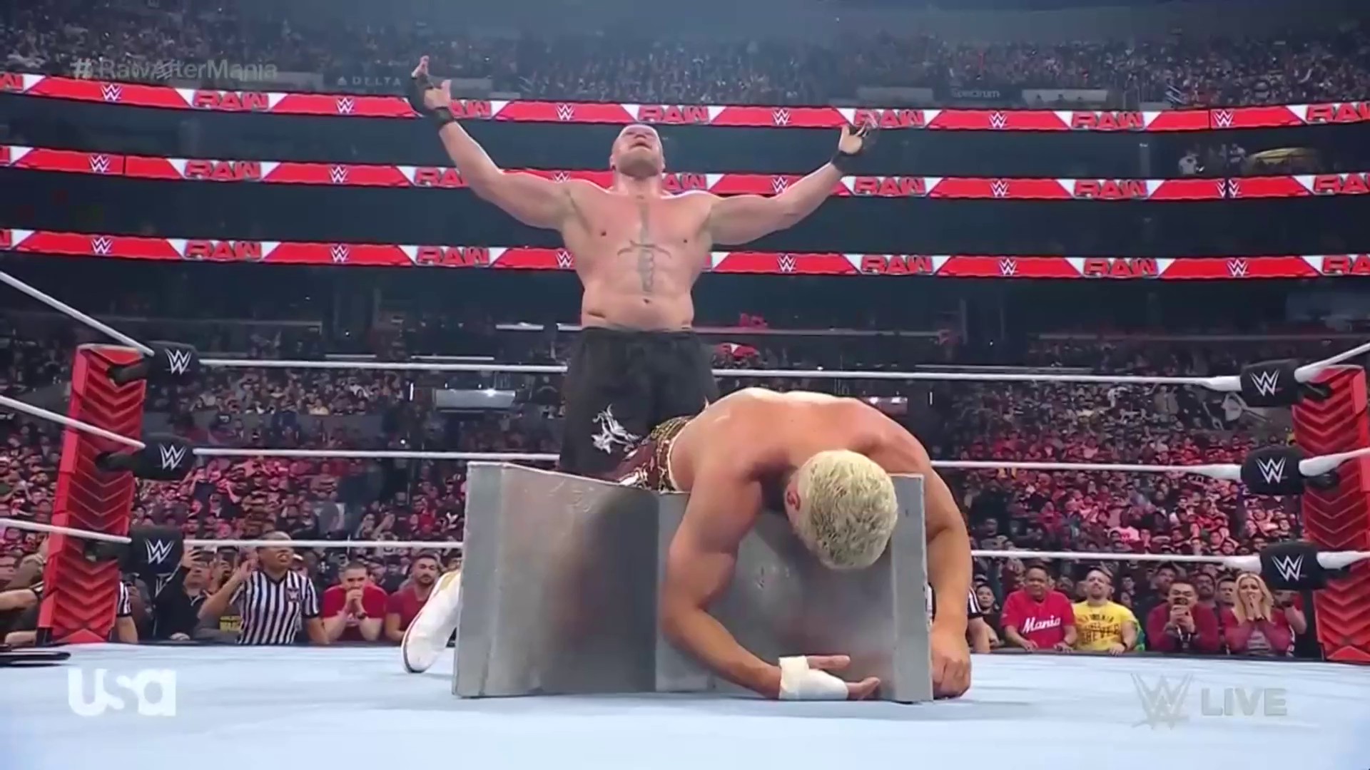 At the top of the show, Rhodes issued a challenge to Roman Reigns and Solo Sikoa for a tag team bout, which Reigns accepted with the caveat that Rhodes’ partner had to be someone who competed at WrestleMania, and could not challenge Reigns for the Undisputed WWE Universal title. Lesnar entered and declared himself Rhodes’ partner for the evening’s main event.