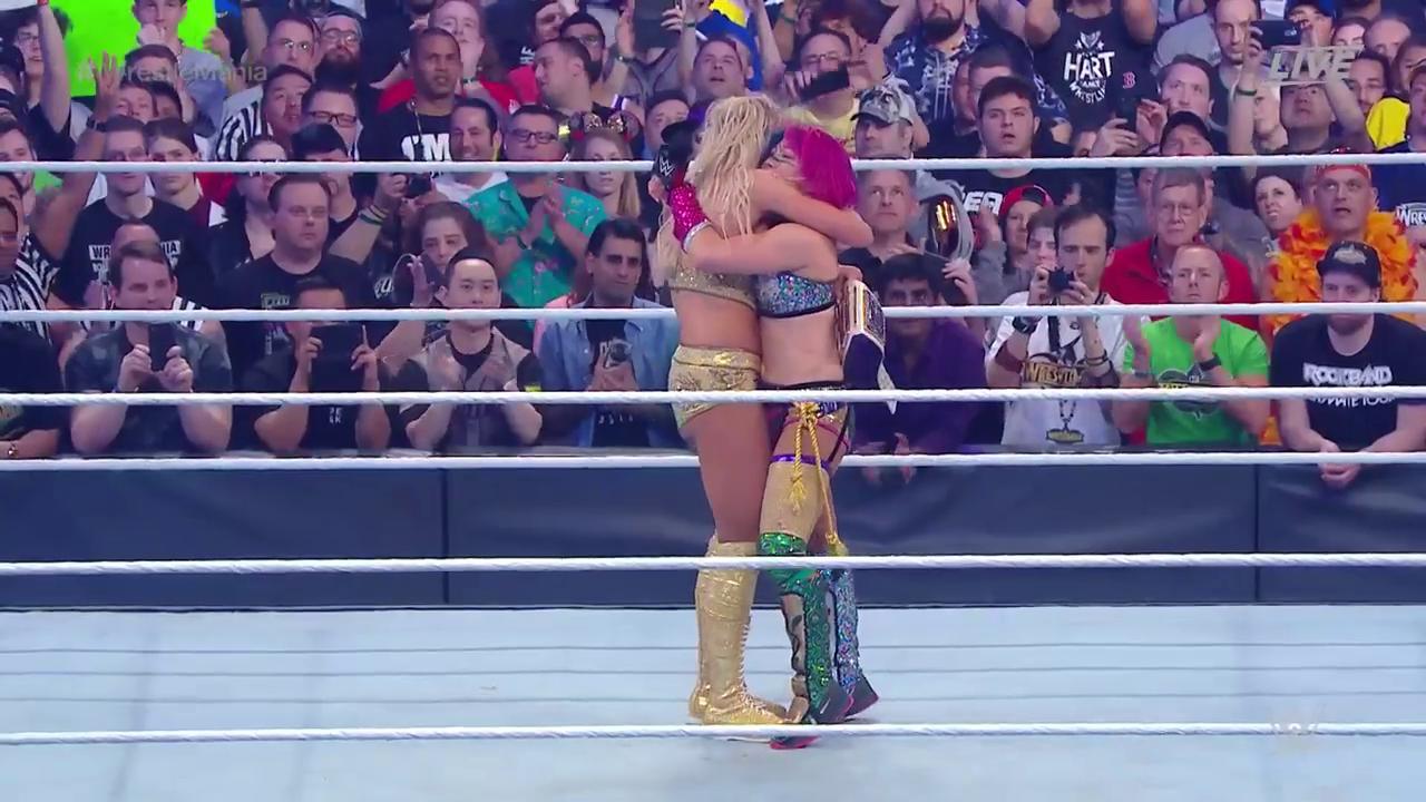 Asuka suffered her first loss tonight at WrestleMania 34, where Charlotte was able to submit her with the figure eight leg lock submission in a long, hard fought back and forth match. Following the bout, Asuka told Charlotte that she was, in fact, ready for her. The two hugged as Charlotte celebrated her win.
