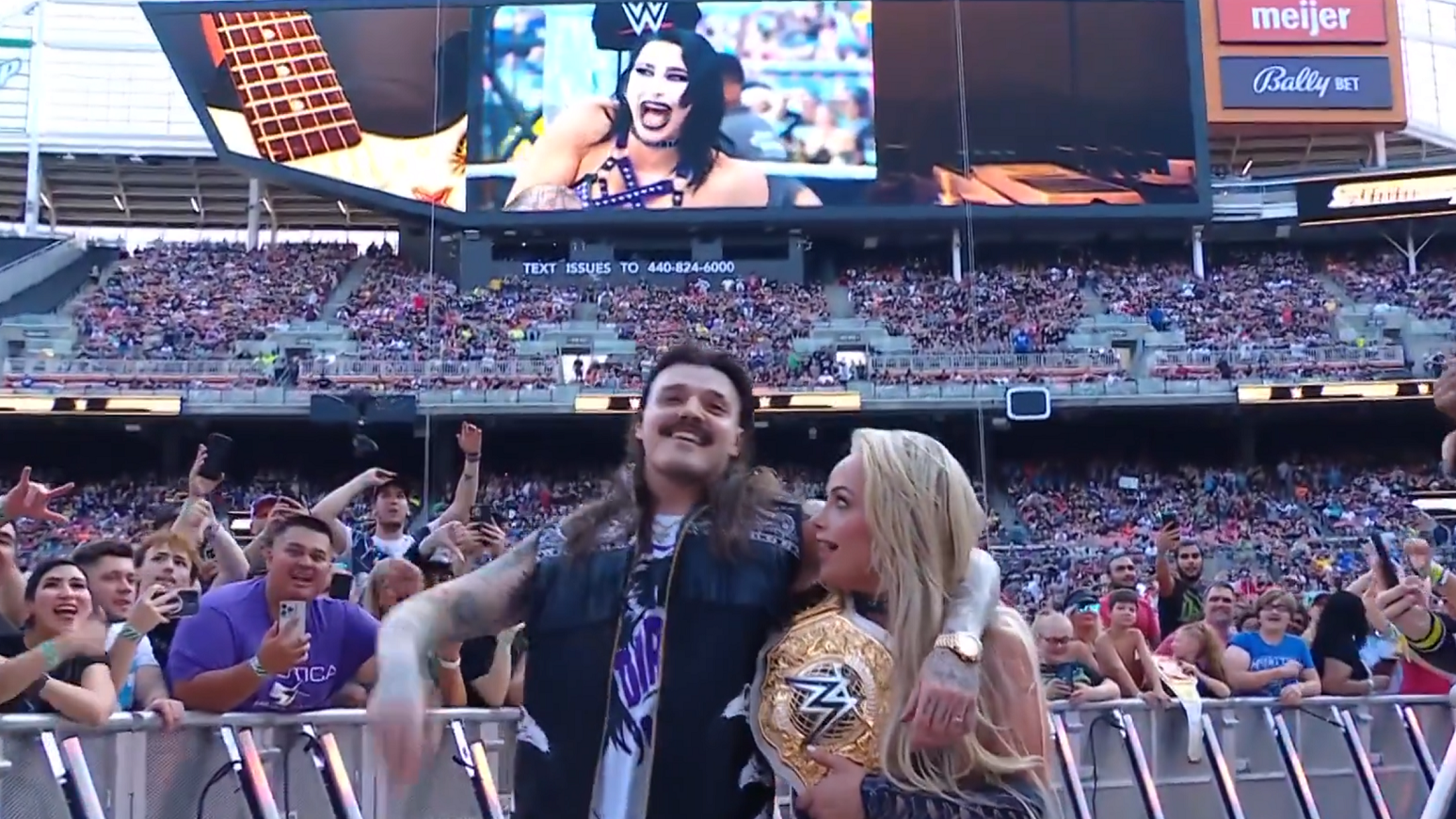 Dominik Mysterio turned on Rhea Ripley in the SummerSlam opener Saturday to allow Liv Morgan to retain the Women’s World title, and Morgan and Mysterio kissed afterwards to cement their new alliance.