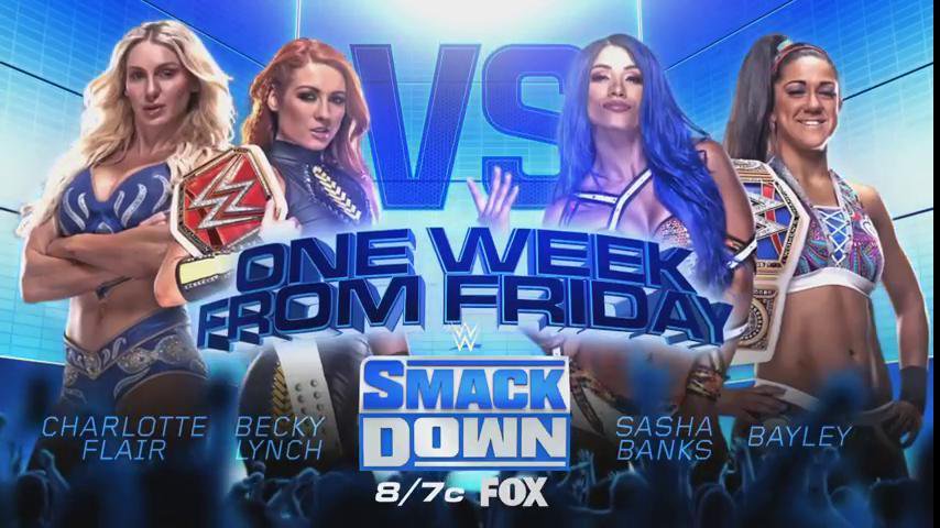 Raw Women’s Champion Becky Lynch & Charlotte Flair will team against Sasha Banks & SmackDown Women’s Champion Bayley on SmackDown’s FOX debut. It’s taking place at the Staples Center in Los Angeles, California on Friday, October 4.