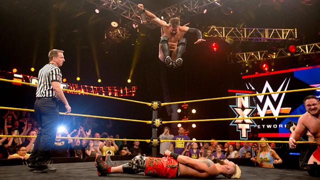 Tye Dillinger beat Hugo Knox with the exposed knee facebreaker after Hugo missed his split leg moonsault