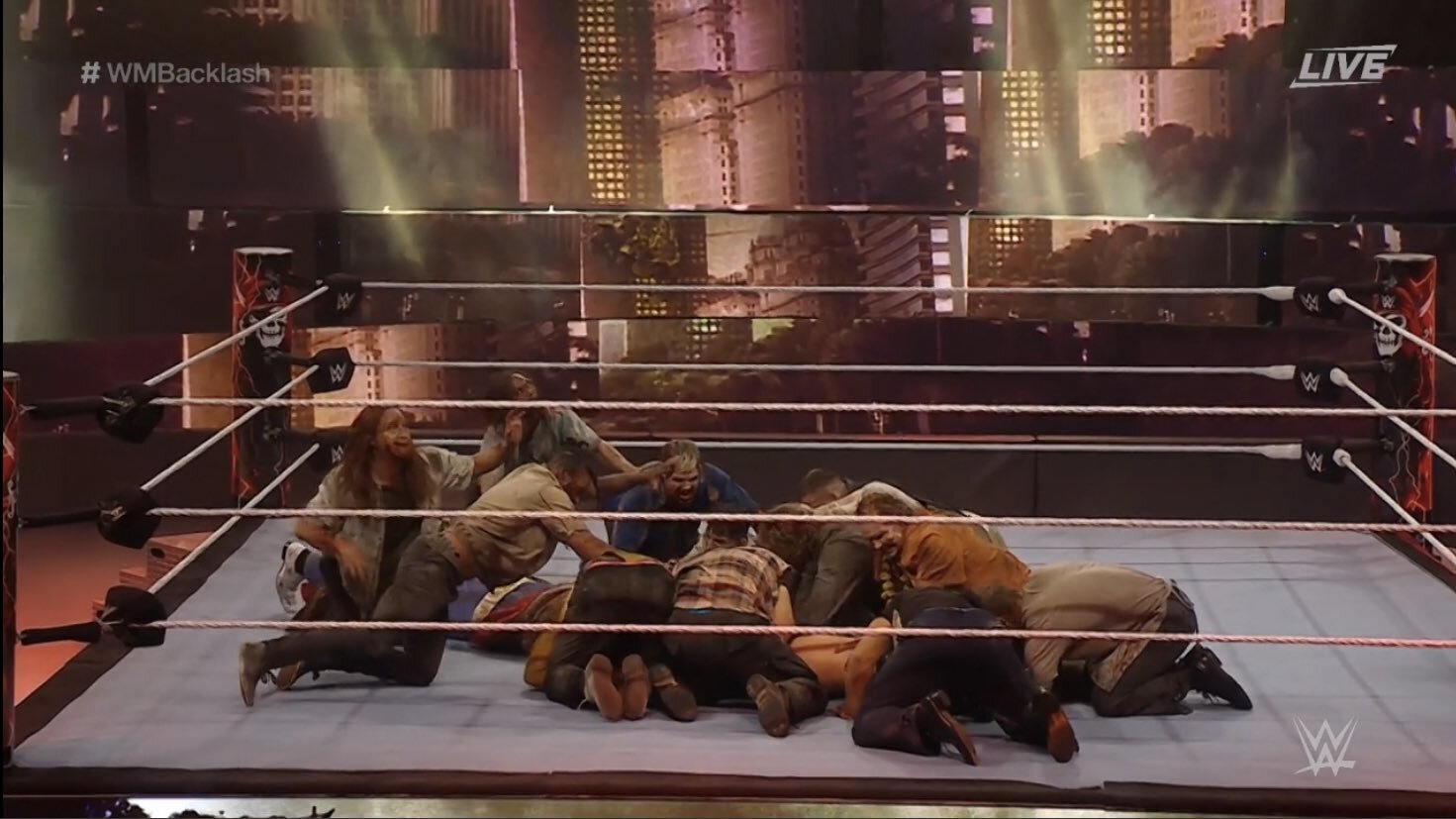 After the match, the zombie horde piled on the fallen Miz, with the assumption being that they were consuming him.