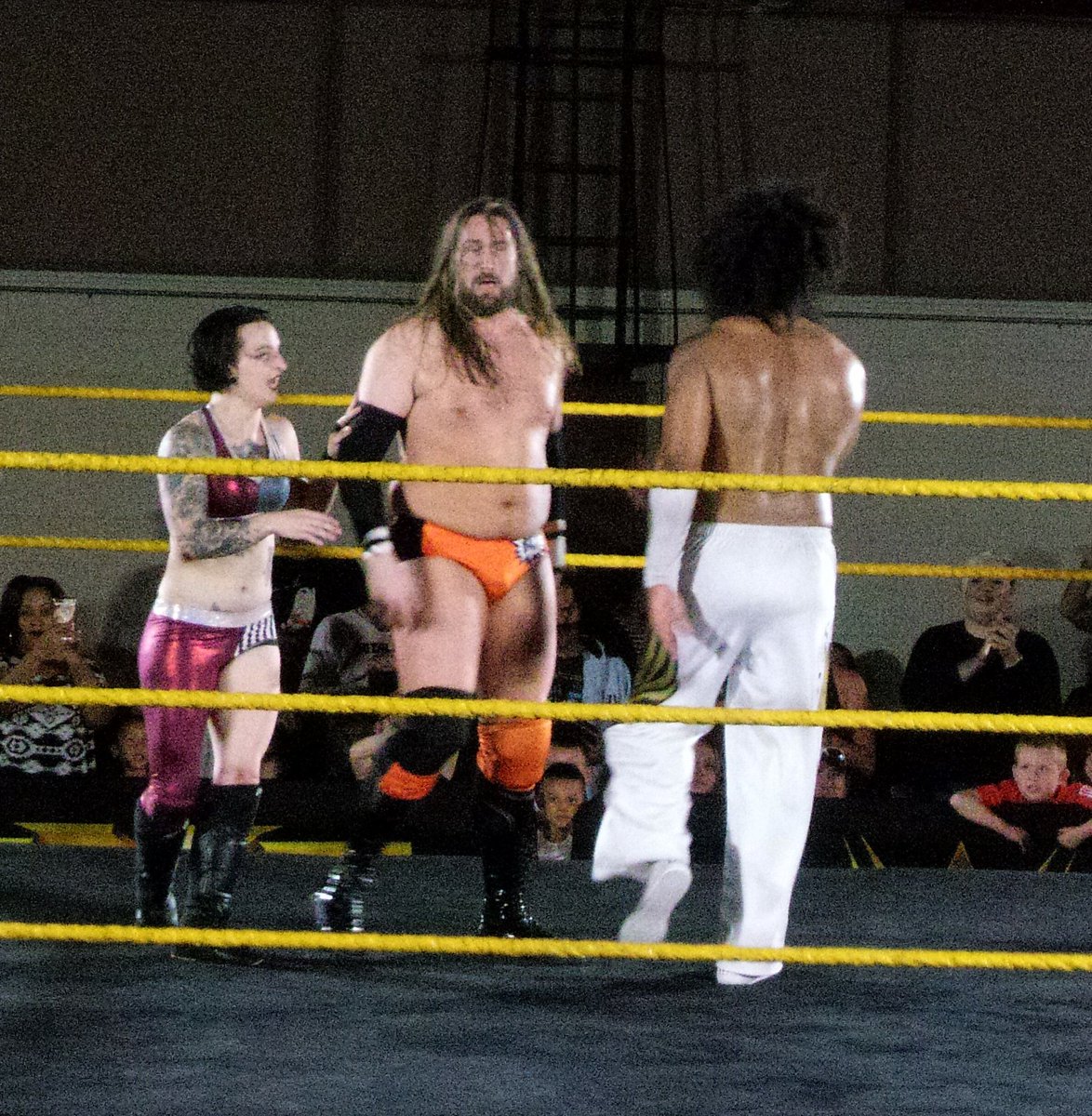 This was the most exciting match in Florida so far this year. Nakamura tried to remove Straggler’s mask, but there was a second mask underneath, so Nakamura put the mask on himself and proceeded to do some excellent lucha with arm drags, rolls, and he even teased a dive. Moss snatched the mask off Nakamura and Nakamura was devastated. Solid action followed and a Kinshasa won it for the good guys.