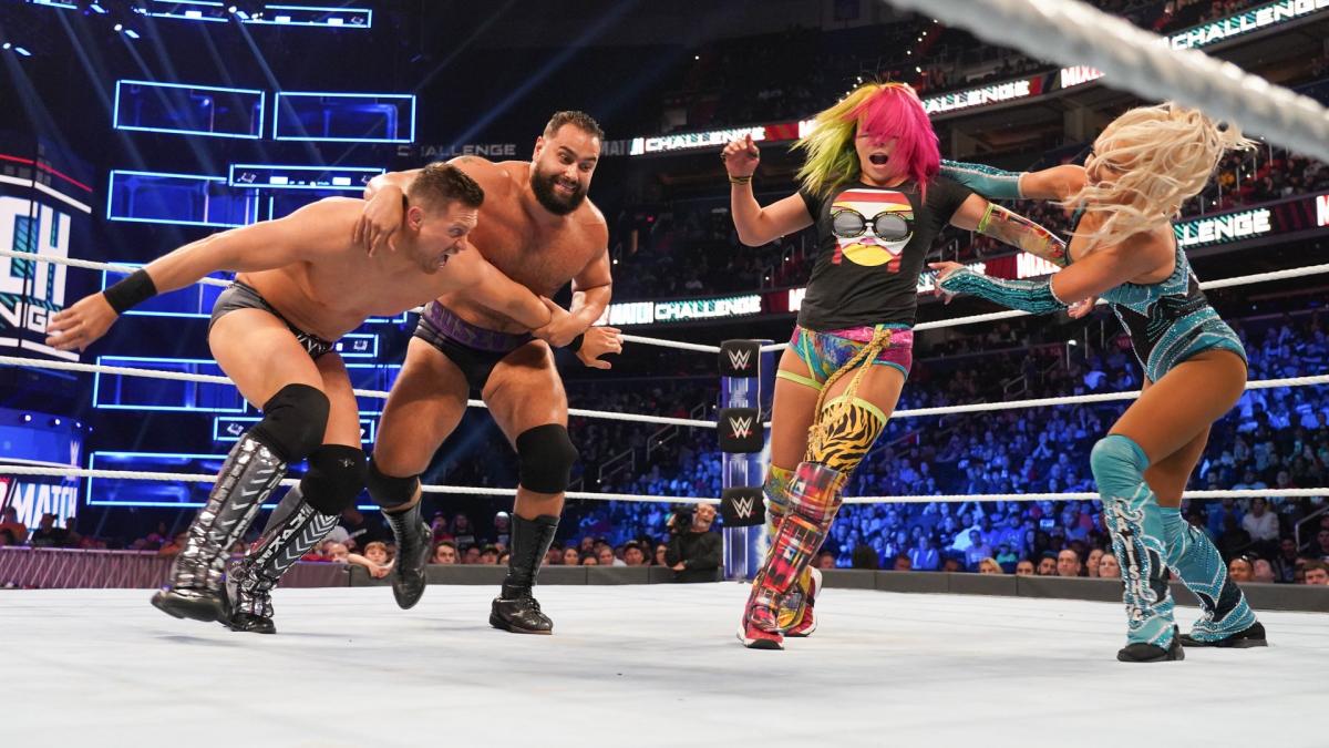 Lana jumped off the apron with a flying crossbody at one point. Asuka got heat on Lana until Asuka missed a splash off the top. Rusev ran wild while he narrated his house cleaning. Both Lana and Rusev got near falls. Miz mimicked Aiden English in a ploy to cause a distraction. That led to a series of cartoonish spots. Asuka made the save when Lana tried to apply the Accolade on Miz. A moment later, Miz saved Asuka on a pinning attempt by Lana.