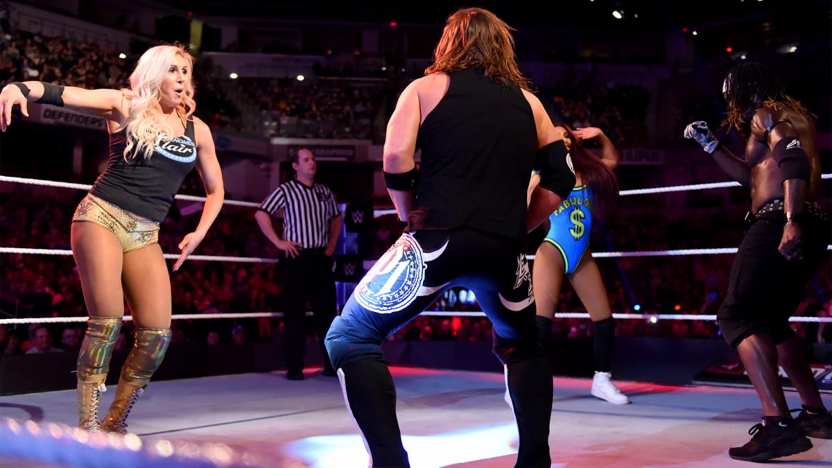 Carmella caught Styles with a flying headscissors to break up the dance party. Carmella begged off from Charlotte. A chase ensued around the ring. Moments later, Carmella applied a headscissors submission — only for Charlotte to power out for a tag to Styles.