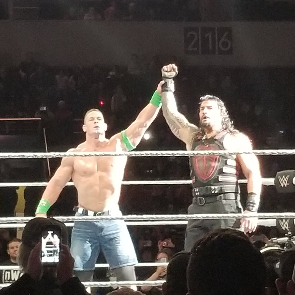 Cena raised Reigns’ arm after and left him to pose and work the crowd alone.