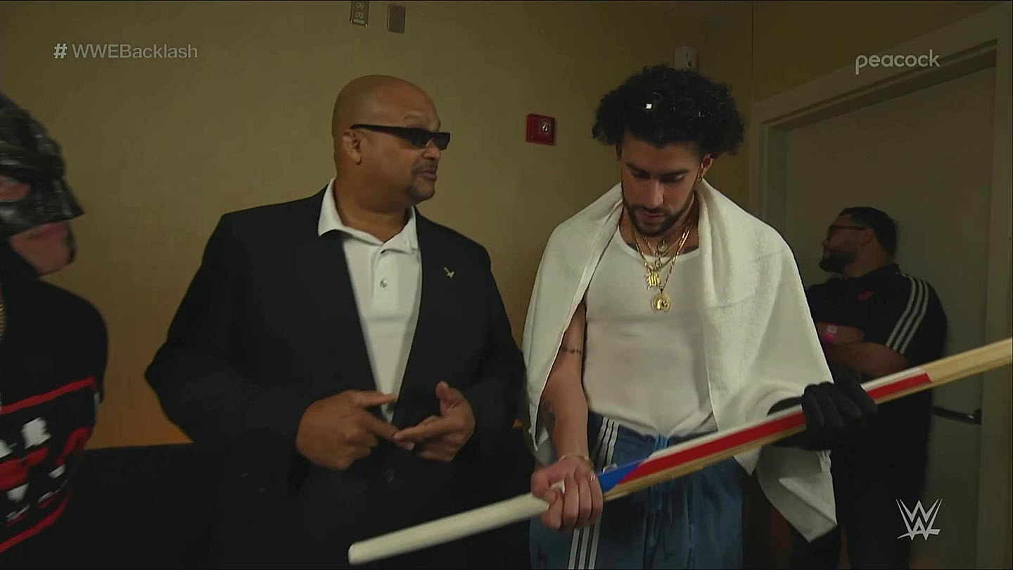 During a backstage segment, Rey Mysterio talked to Bad Bunny, who was preparing for his match against Damian Priest in a San Juan Street Fight later in the show. That was when Savio Vega walked in to an enormous reaction. He shook hands with Bunny and handed him a kendo stick with the Puerto Rican flag on it.