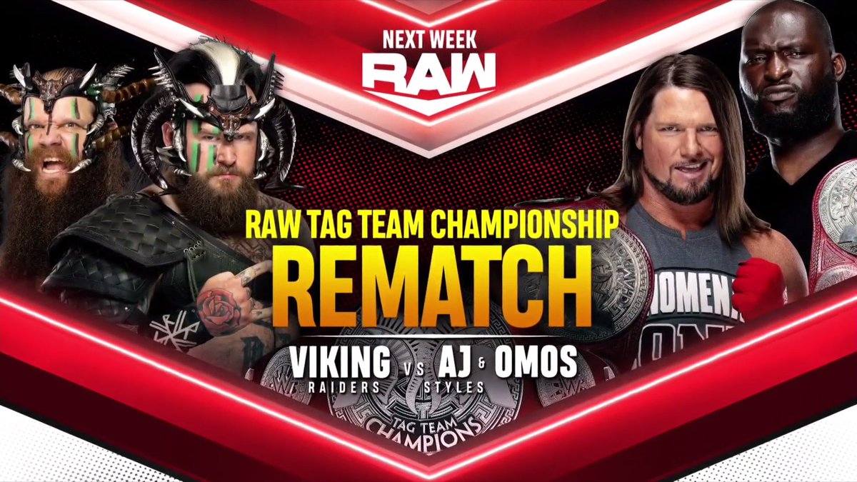 Next Monday’s WWE Raw will feature a Tag Team title rematch from Money in the Bank as AJ Styles and Omos will defend the titles once again against the Viking Raiders.