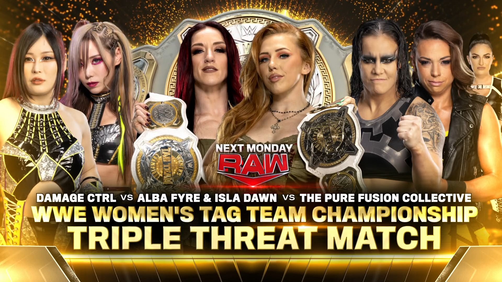 WWE Women’s Tag Team Champions Alba Fyre & Isla Dawn will defend their titles in a triple threat match against Damage CTRL’s IYO SKY & Kairi Sane, and Shayna Baszler & Zoey Stark of the new Pure Fusion Collective group on next week’s Raw.