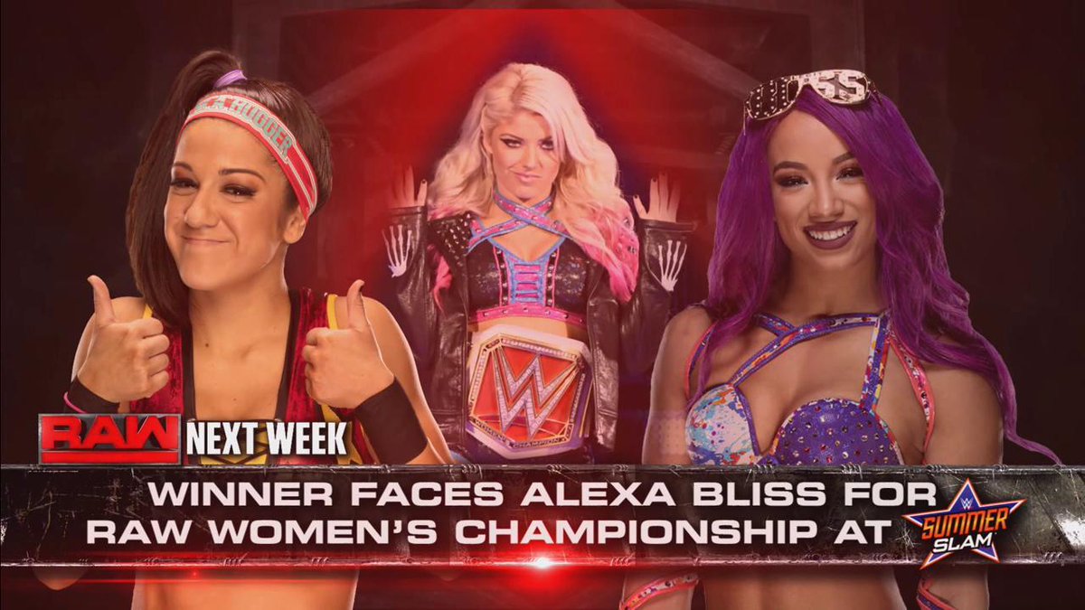 Sasha Banks will face Bayley in a match to determine who will challenge for Alexa Bliss’ Raw Women’s Championship at SummerSlam. That was set up last night in a storyline with Banks and Bayley both pleading their cases to Kurt Angle after wins over Bliss in recent weeks.