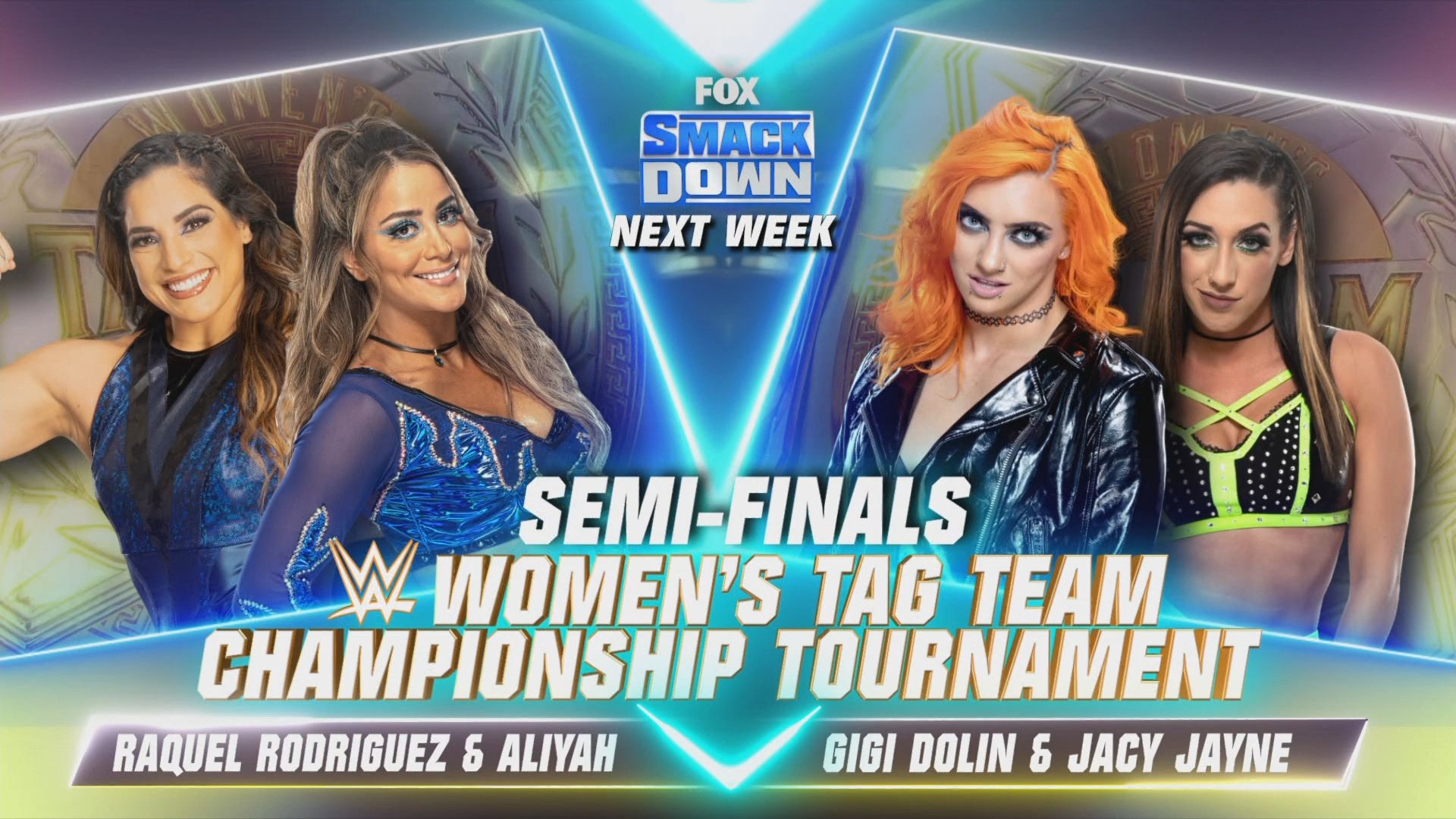 - WWE Women’s Tag Team Championship tournament semifinals: Toxic Attraction (Gigi Dolin & Jacy Jayne) vs. Raquel Rodriguez & Aliyah