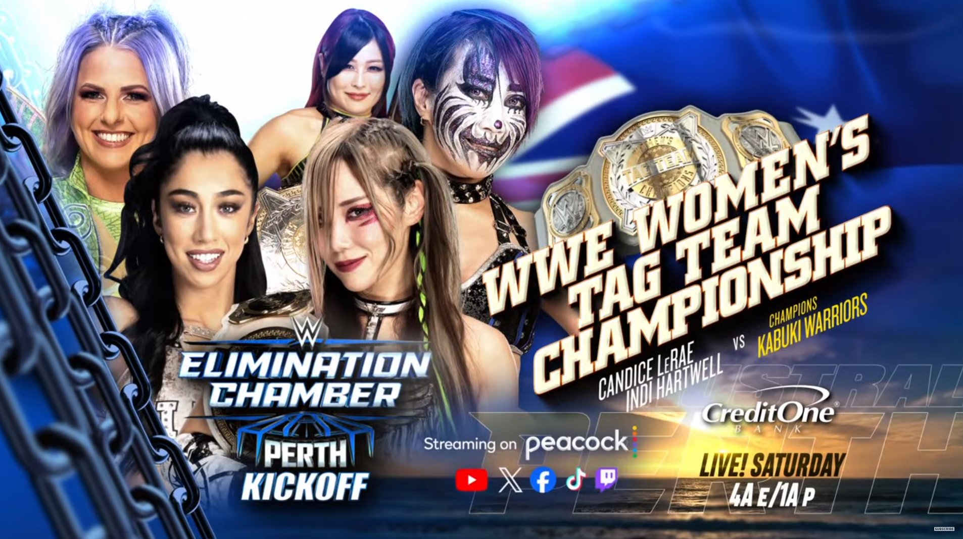WWE revealed during Thursday night’s Elimination Chamber press event that The Kabuki Warriors will defend the Women’s Tag Team Championship against Indi Hartwell & Candice LeRae on the Kickoff pre-show.