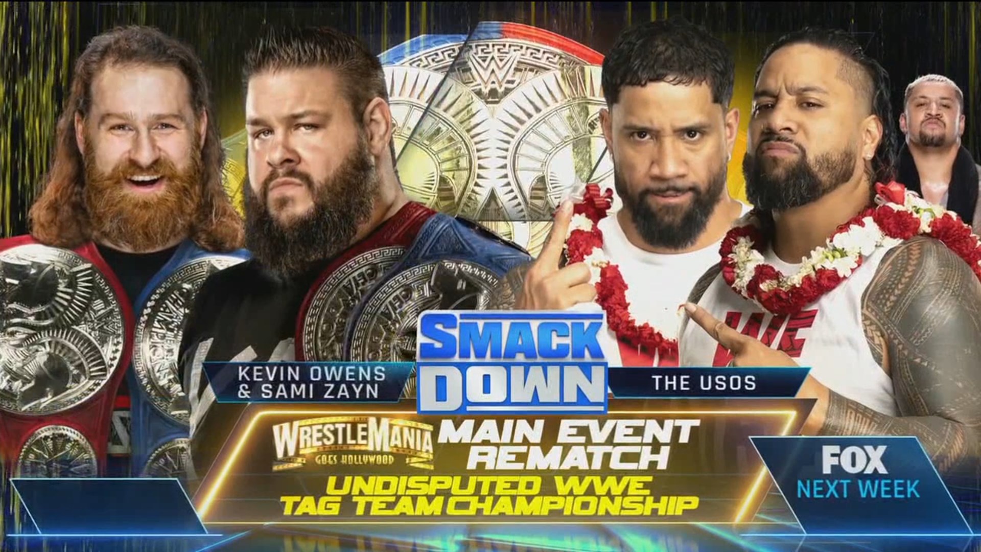 As announced on this week’s episode, Sami Zayn & Kevin Owens will defend the Undisputed WWE Tag Team Championship against The Usos on next week’s SmackDown.
