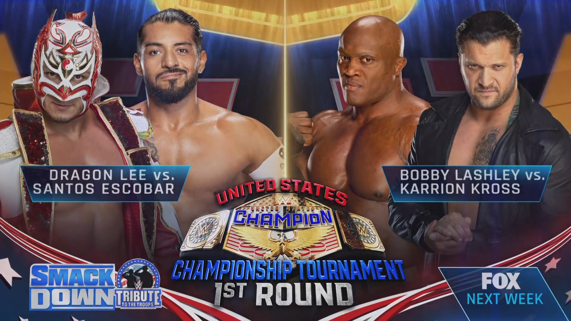 The tournament begins on next week’s SmackDown Tribute to the Troops show with a pair of first round bouts. Dragon Lee will face Santos Escobar in one contest, while Bobby Lashley takes on Karrion Kross in the other.