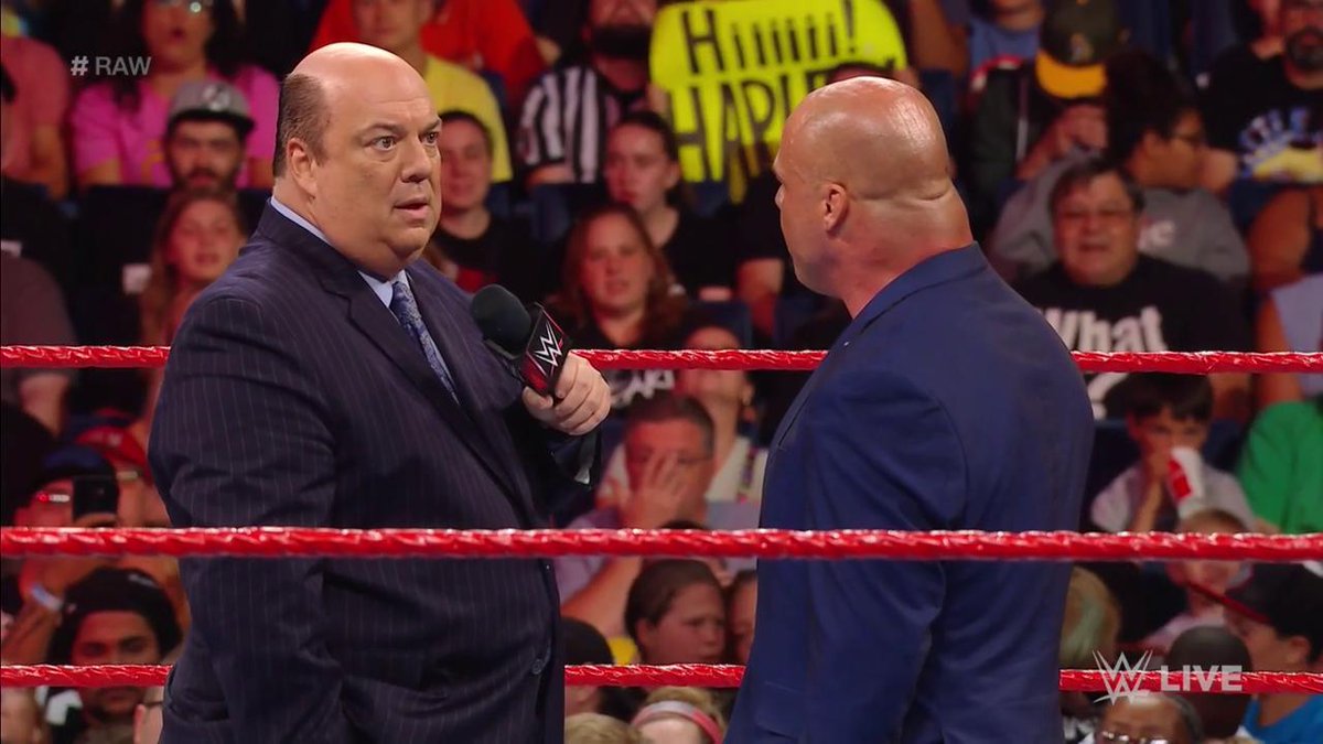 The storyline of Kurt Angle issuing an ultimatum for Lesnar to show up on tonight’s Raw or agree to a date to defend the Universal title led to Paul Heyman appearing instead. Heyman claimed that Angle and the fans have it wrong, Lesnar loves being in WWE and being Universal Champion. Angle asked why Lesnar doesn’t show up then, and Heyman said Lesnar wants to represent WWE and hold the Universal Championship when he challenges for the UFC Heavyweight title.
