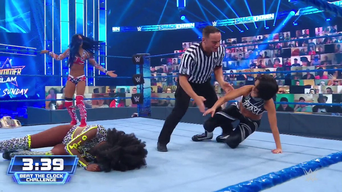 Corey Graves interviewed Banks and Bayley on SmackDown tonight and asked about dissension between them and which match would happen first at SummerSlam. Naomi then interrupted them, setting up the Beat the Clock Challenge.
