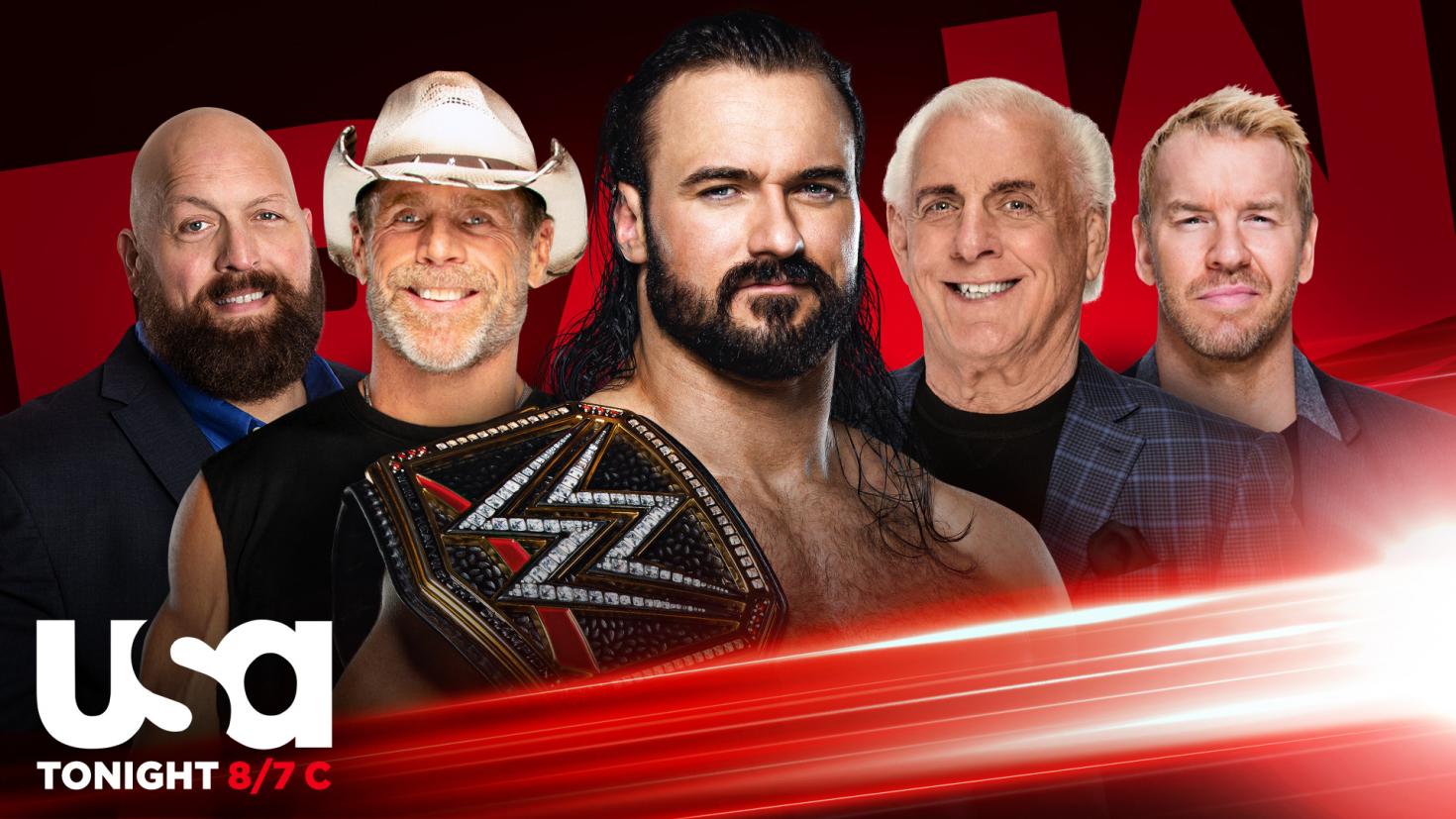 Ric Flair, Big Show, Christian, and Shawn Michaels came out individually. Michaels welcomed us to Raw and introduced Drew McIntyre. McIntyre hugged each guy and mentioned how cool it was to share the ring with them.