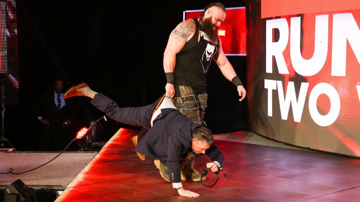 Even after getting rehired, Strowman throws Michael Cole off the stage and onto security