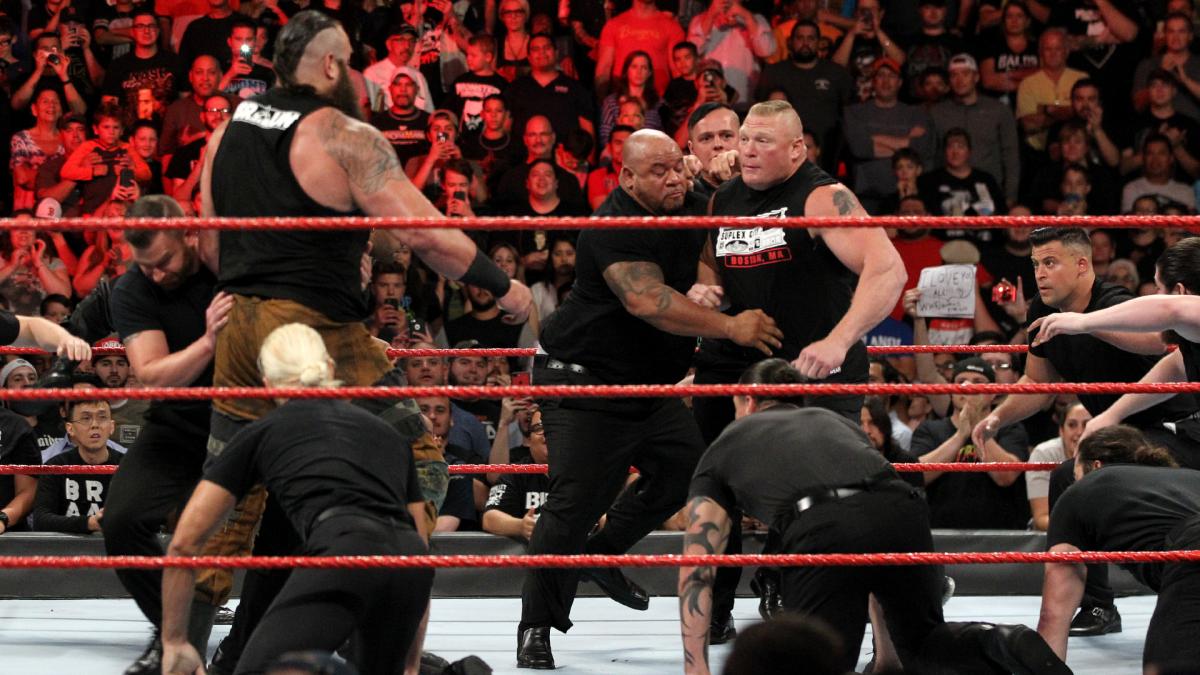 A face-to-face-to-face-to-face confrontation between Brock Lesnar, Samoa Joe, Braun Strowman, and Roman Reigns closed the episode. And as expected, things broke down into a brawl before security and some of the locker room came out to stop it.