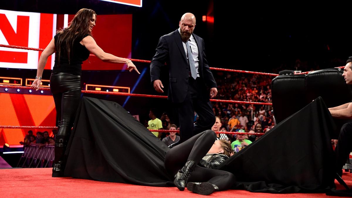 Stephanie McMahon puts Ronda Rousey through a table