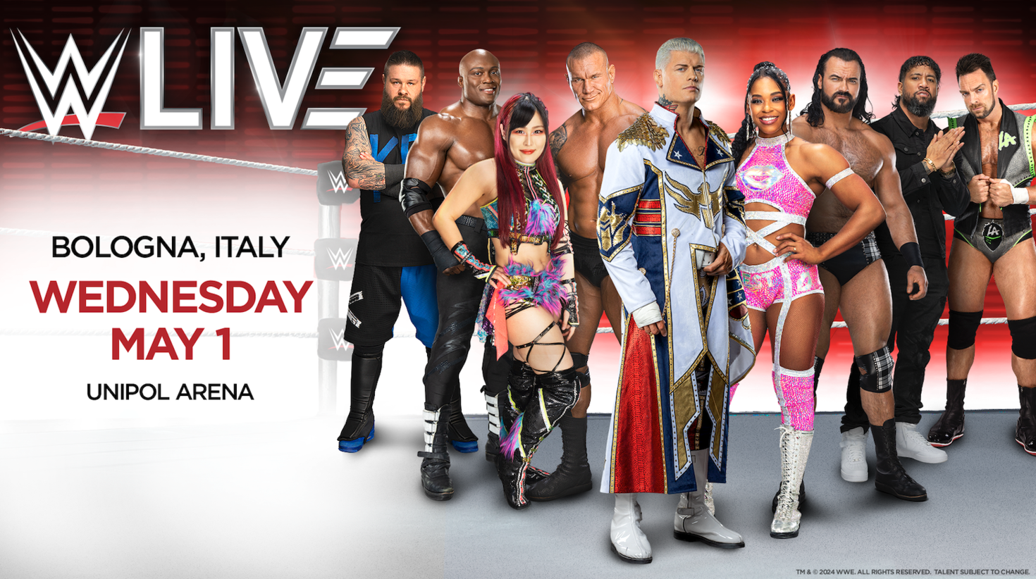 Fans attending WWE Live in Bologna, Italy, will see their favorite WWE Superstars from both Raw and SmackDown in action including ‘The American Nightmare’ Cody Rhodes, Bianca Belair, Randy Orton, WWE Women’s Champion IYO SKY, Drew McIntyre, LA Knight, Bobby Lashley, Kevin Owens, ‘Main Event’ Jey Uso, and many more.