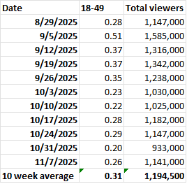 Note: Beginning on October 1, Nielsen started using the new Big Data + Panel measurement system. The change has resulted in a severe decline for most pro wrestling shows.