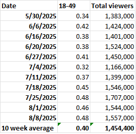 Listed below are the last 11 weeks of viewership numbers and 18-49 demo ratings for SmackDown, as well as the 10-week average in both categories. This week’s show was up 7.1 percent in overall viewers and 20 percent in 18-49 as compared to the recent averages.
