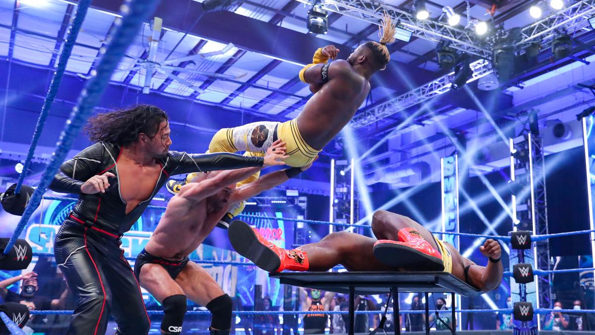 Shinsuke Nakamura & Cesaro put Kofi Kingston & Big E through a table