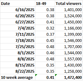 The show went head to head with 2 separate NFL preseason games on CBS and the NFL Network. The CBS game topped all of television with a 0.42 rating and 2.563 million viewers.