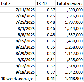 As compared to the same week in 2024, the overall viewership was down 10.2% while the 18-49 rating was down 17.8%.