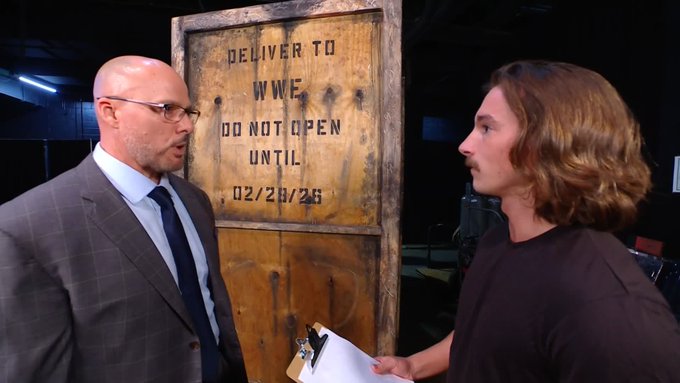 On Monday, Adam Pearce was seen arguing with a deliveryman who had just delivered a large crate with the message “Deliver to WWE, do not open until 2/28/26” written on it, the same day as WWE’s Elimination Chamber PLE. Pearce was upset that the deliveryman had no additional information regarding the box. The segment ended with Pearce directing the deliveryman to send it to Nick Aldis for Friday’s SmackDown so he could deal with it.