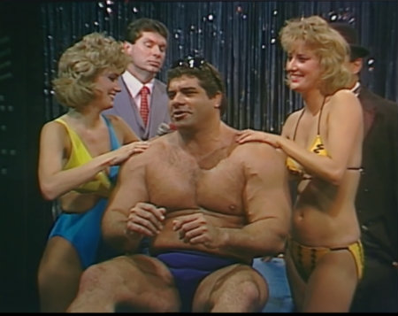 The girls are just going to town on Muraco, unloading the suntan oil. McMahon says, “this is quite the experience.” The show ends with McMahon wrapping up at his desk saying that Bobby “The Brain” Heenan will be a guest next, when the two models come back out and starting rubbing the oil on Hayes, over his clothes.