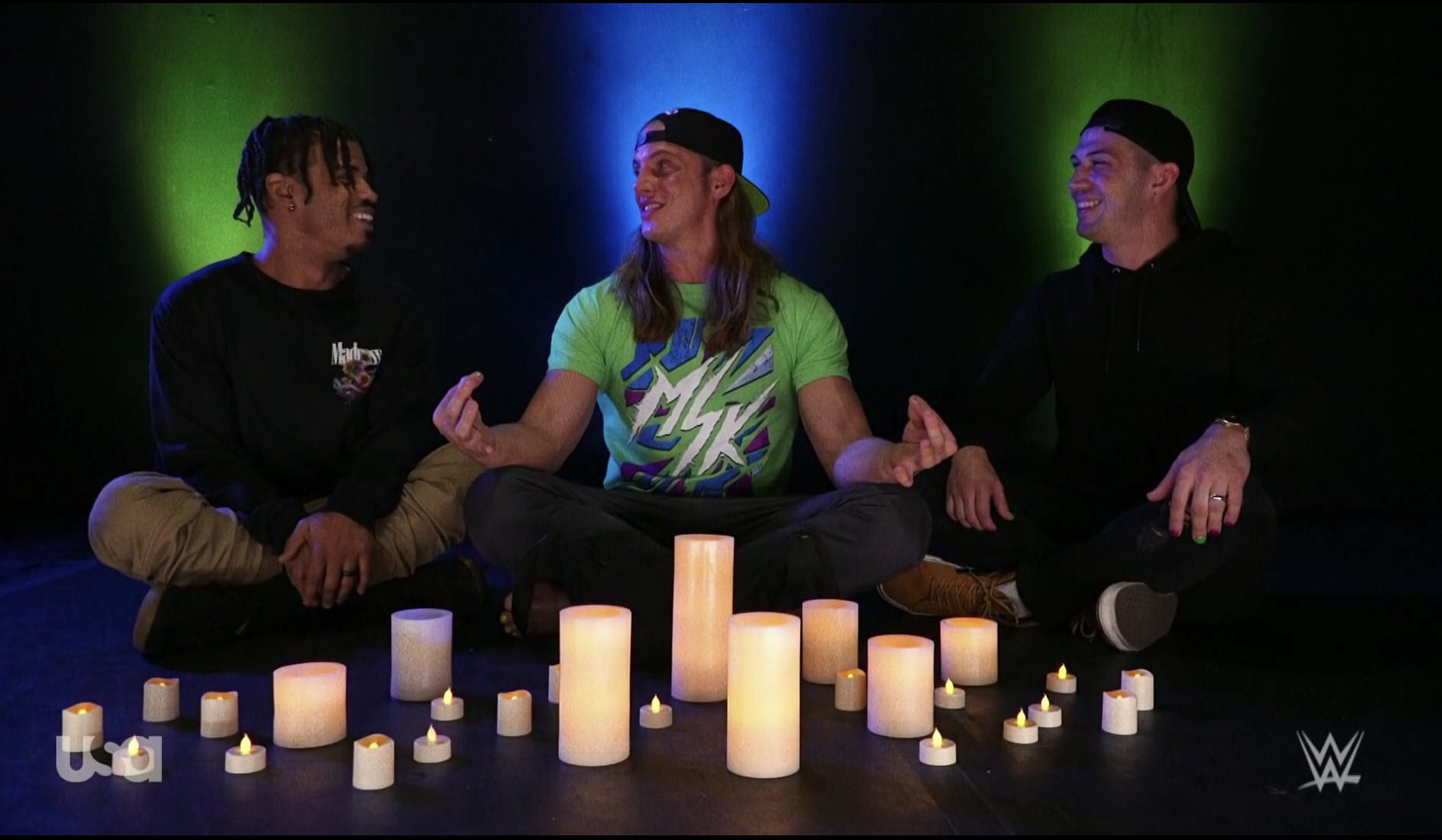 The weeks-long build came to a head on this week’s show when the person behind the door was revealed to be Raw star and half of the Raw Tag Team Champions, Riddle. He called himself the “shaman bro” as MSK and Riddle sat cross-legged surrounded by candles. They asked him if they should be more serious. Riddle told them they would climb back to the mountaintop (regain the NXT titles) by being themselves and would be by their side, as long as they opened the bag they brought. The trio then opened the bag, but it was a tease for the next vignette.