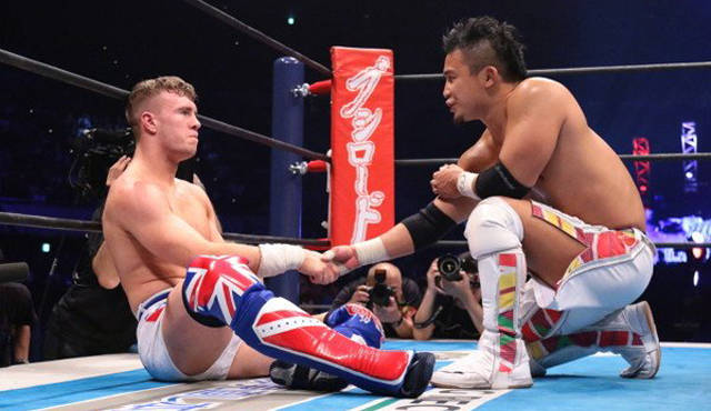 KUSHIDA used a Pele kick which Ospreay followed with a standing Spanish fly for a near fall. He went for the Sky Twister but KUSHIDA got his knees up. Ospreay got out of Back to the Future, but KUSHIDA used a Dragon suplex. He went up for the moonsault, but Ospreay got up and dropkicked him. Both were standing on the middle rope when KUSHIDA put on the Hoverboard lock. Ospreay hit a shooting star, then a reverse huracanrana on the ring apron, but KUSHIDA managed to get in just before the 20 count. Ospreay followed with the Essex Destroyer, a crazy move that ends up as a DDT, for a near fall.