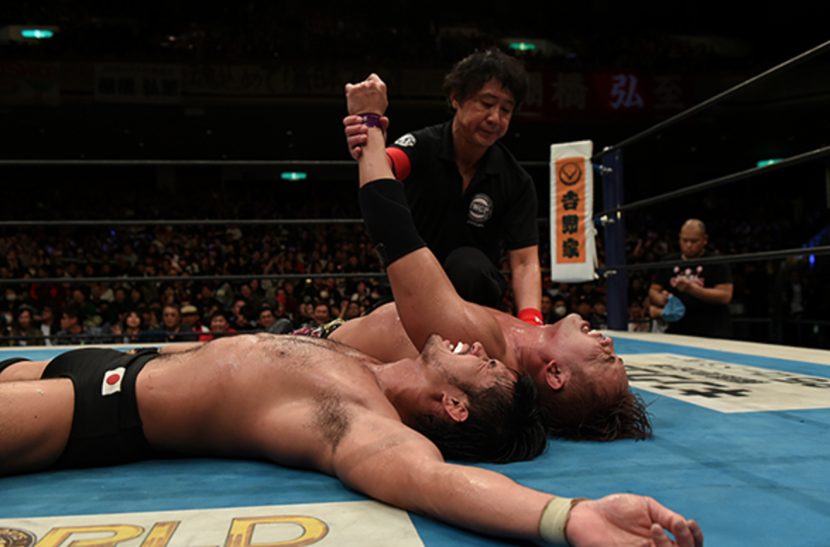 When the match was over, Shibata and Okada both collapsed. The idea is that both men gave everything they had in a war that lasted 38:09. Had it not been for Okada’s match with Kenny Omega, this would have been a strong favorite for match of the year. The idea is both gave it everything they had. Okada won, but it was a battle of attrition and by the time it was over, neither had anything left. As Shibata was being helped out of the ring to the back, he lost his balance and fell to his knees more than once.