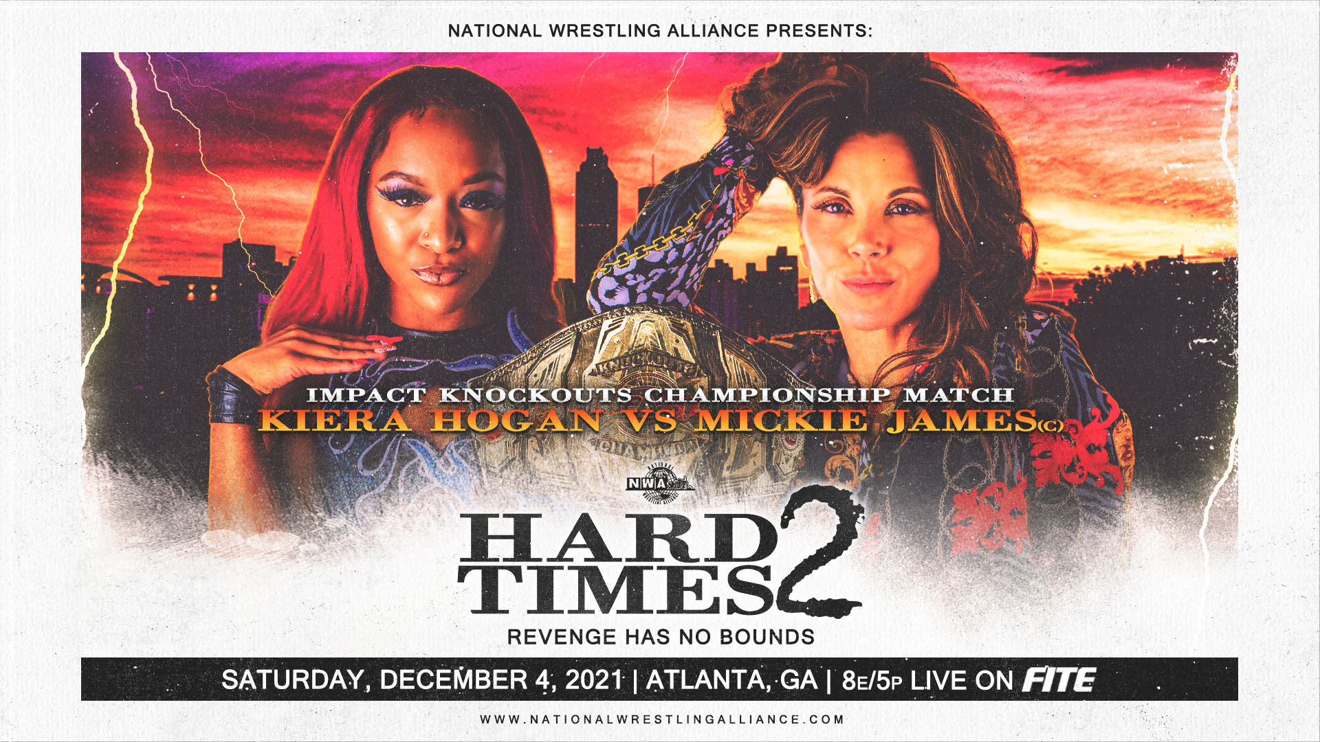 “Saturday, Dec 4th at #HardTimes2, @IMPACTWRESTLING Knockouts Champion @MickieJames will be defending her title against @AEW ‘s @HoganKnowsBest3,” the NWA announced. “This makes EIGHT multi-company title matches in one night!”