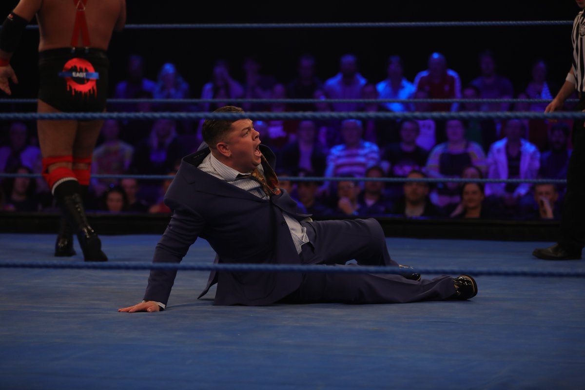 We then went to footage shot earlier that day of a confrontation between former champion Grado and WOS Wrestling executive producer Stu Bennett. The two had previously clashed over Bennett’s belief that Grado is a poor representative for British wrestling due to not taking the sport seriously by always acting the clown. Bennett reluctantly accepted Grado’s request for a match tonight, but he demanded that Grado treat the match seriously.