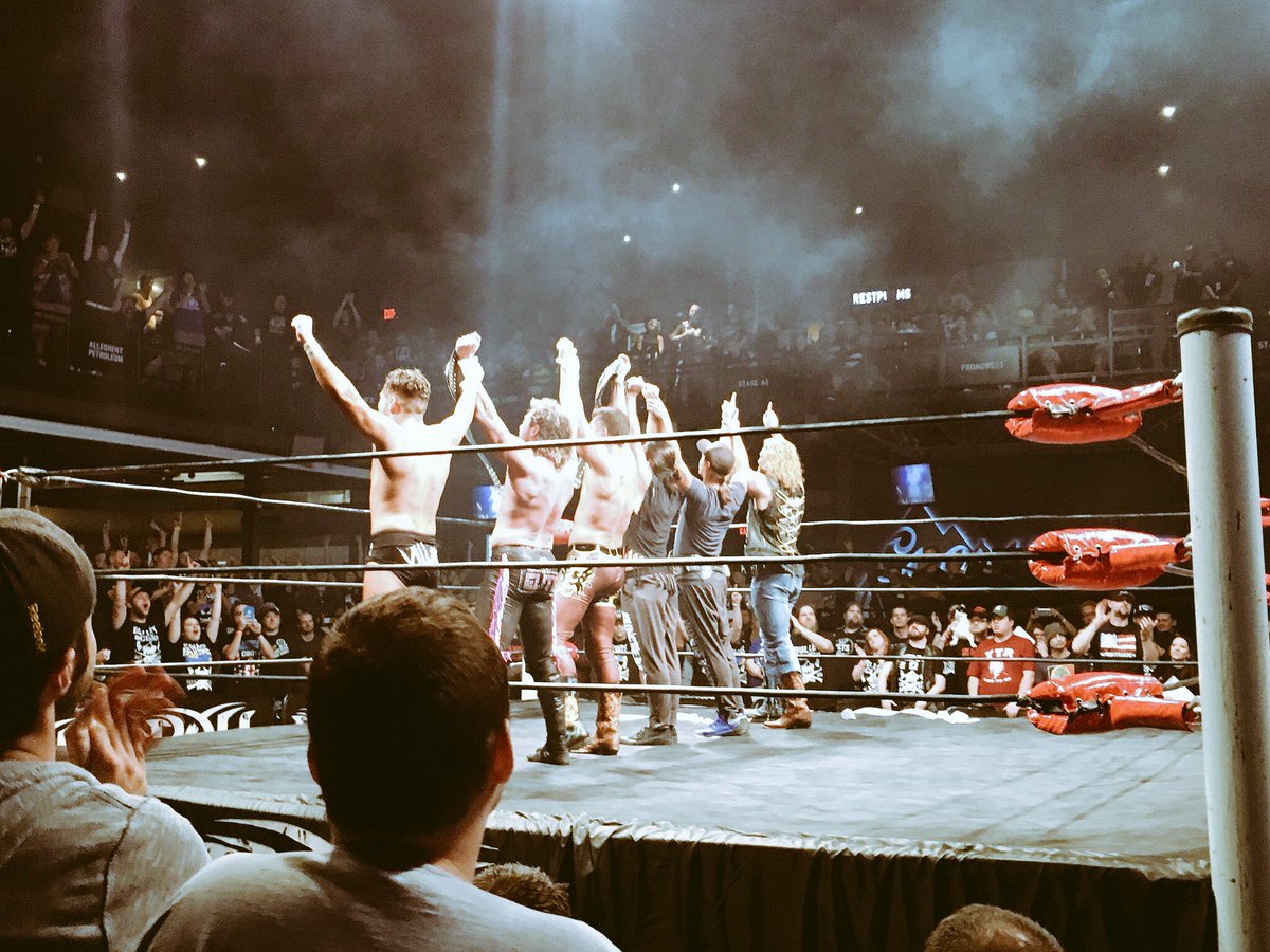 The crowd was definitely there to see the Bullet Club, and there to see Omega in particular. The Young Bucks and Page ran in towards the end of the match, resulting in Scurll running Yano into all 10 boots of the Bullet Club in the corner. Scurll submitted Yano with the chicken wing shortly after.